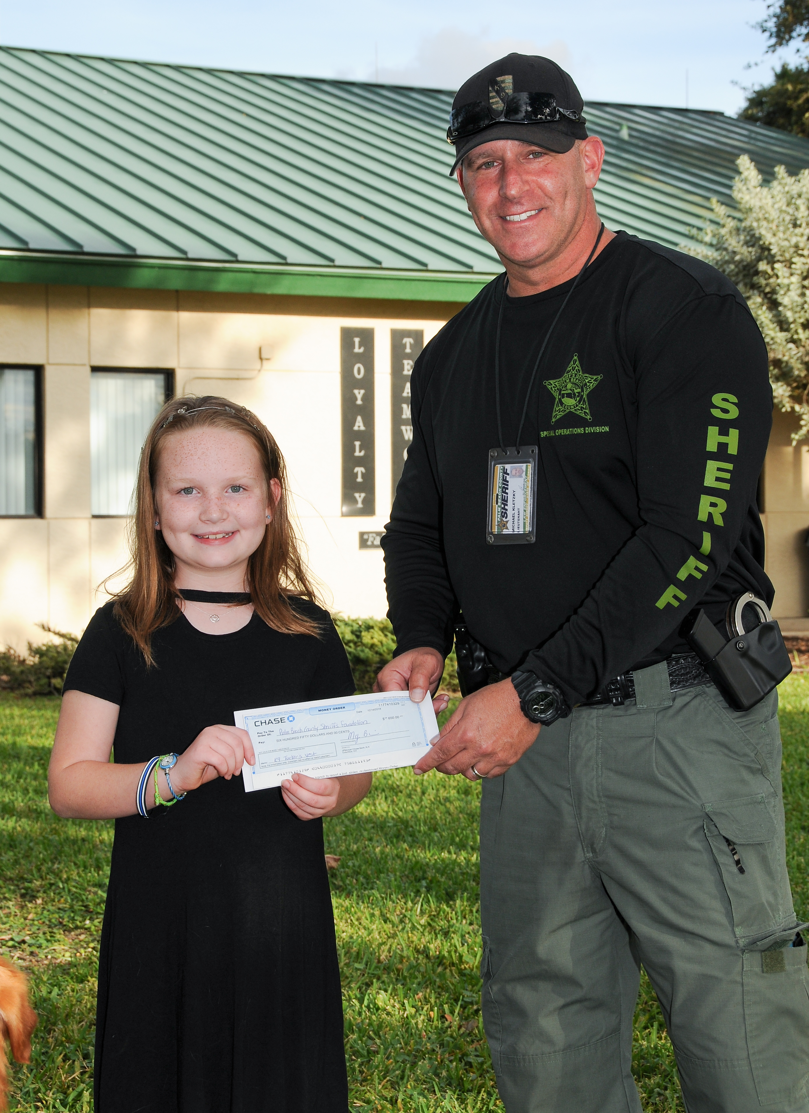 PBSO Deputy Luis Ledbetter and Search and Recovery K-9 Tucker met a little girl named Sammie. When Luis told Sammie about Tucker’s trip to the Panhandle after Hurricane Michael, and the fact that a protective vest was being purchased by the Sheriff's Foundation for Tucker, Sammie wanted to contribute (in the past she raised money for wreaths at the veterans cemetery). Sammie had her 9th birthday party in December of 2018, and she asked her guests for cash donations instead of gifts. She was able to raise $650 to help pay for the vest! Not many kids are going to pass up birthday presents in order to help others, but that's just what this thoughtful little girl did. Thank you, Sammie!